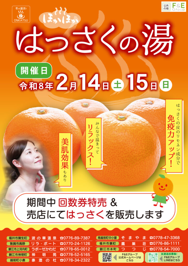 2026年2月14日(土)・15日(日)の2日間限定で、はっさく湯を実施いたします。爽やかな柑橘の香りが湯船いっぱいに広がり、心も身体もリフレッシュしていただけます。